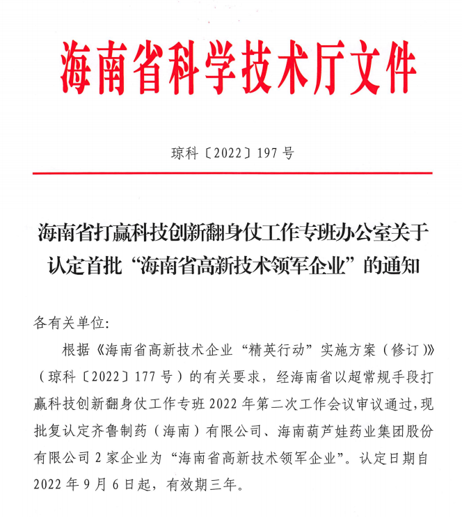 近日,海南省科学技术厅发布的《海南省打赢科技创新翻身仗工作专班办公室关于认定首批“海南省高新技术领军企业”的通知》中显示,批复认定海南AG庄闲药业集团股份有限公司等2家企业为“海南省高新技术领军企业”。认定日期自2022年9月6日起,有效期三年。